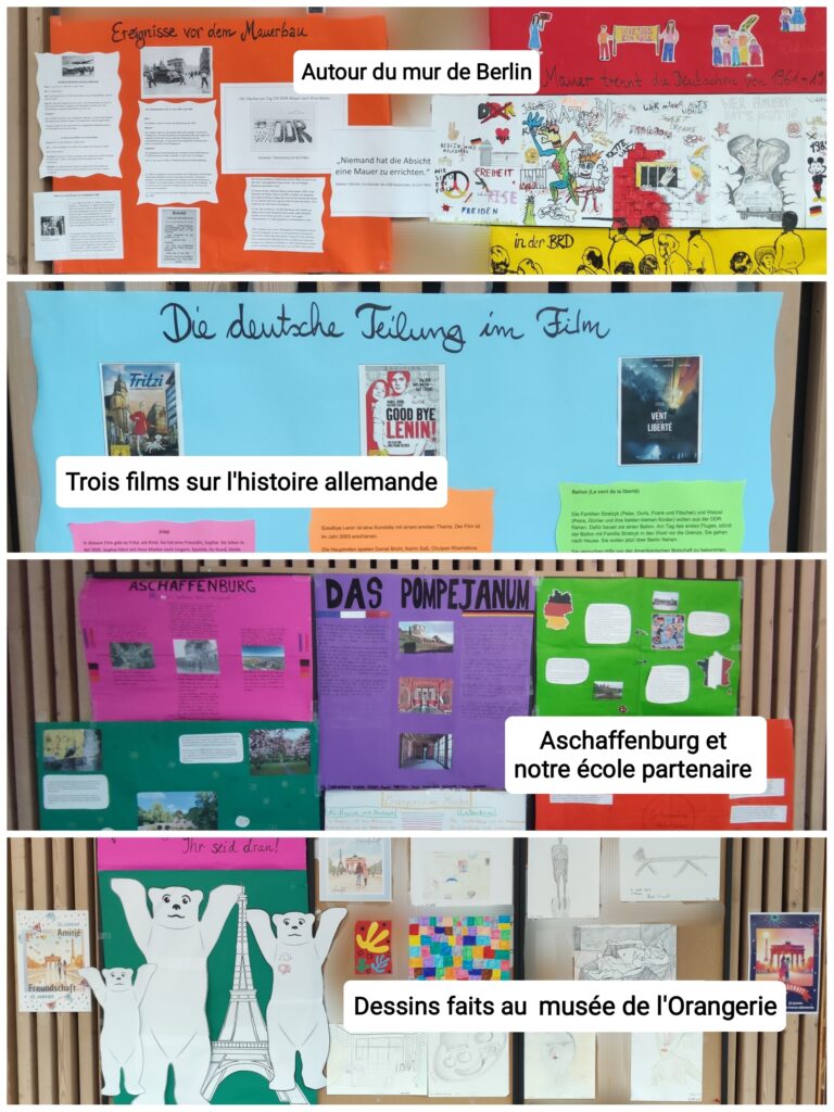 À l’occasion de la Journée franco-allemande, plusieurs actions ont été mises en place dans notre lycée. Citons notamment l’exposition éphémère en plusieurs parties, préparée par les élèves germanistes. Les élèves de 3ème LV2 ont conçu les affiches dédiées à Aschaffenburg, la ville jumelée avec Saint-Germain-en-Laye, et à notre école partenaire, le Kronberg-Gymnasium. Les élèves de 2ndeLVB et LVC ont présenté leur travail sur la construction et la chute du mur de Berlin, ainsi que sur la représentation de cet épisode majeur de l’histoire allemande du XXème siècle dans trois films allemands (Fritzi, Vent de la liberté, Good bye, Lenin!). Enfin, les dessins des germanistes réalisés lors de leur visite du musée de l’Orangerie, ont également été exposés.