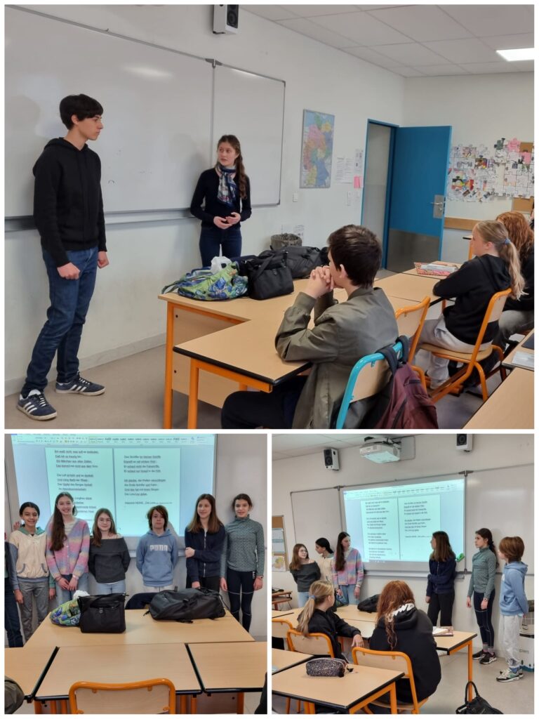 Les élèves de 5e (LV1) ont exploré la célèbre légende de la Loreley, à travers la version poétique de Heinrich Heine, dans le cadre du concours « Cicéronnades ». Ils ont bien entendu travaillé leur prononciation mais se sont aussi penchés sur la vie de Heine, ont illustré le poème et l’ont confronté à la version de Guillaume Apollinaire. Dans le même esprit, les élèves de Terminale (LVB) ont étudié « Waldgespräch » de Joseph von Eichendorff, un autre texte romantique revisitant le mythe de la Loreley. Ce travail s’est conclu par une rencontre inter-niveaux : les Terminales sont allés à la rencontre des élèves de 5e, et chaque groupe a présenté « sa » poésie, dans un esprit de partage et de transmission.