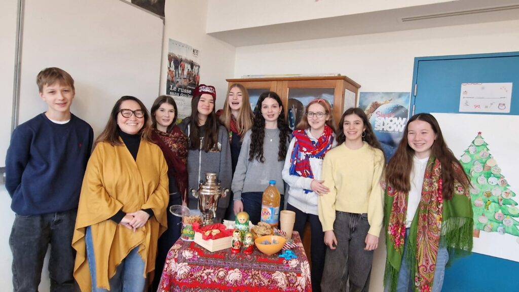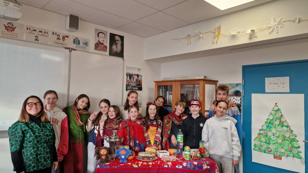 La fin d’année est le moment de tenter la réalisation des recettes russes, de mettre son plus joli châle et de boire du thé du samovar. Notre sapin collaboratif a égayé la salle 109 du Lycée international de Saint-Germain-en-Laye tout le long de ces dernières semaines avant les vacances. Enfin est arrivé le jour où on a pu écrire : До каникул 1 день ! = 1 jour avant les vacances!
