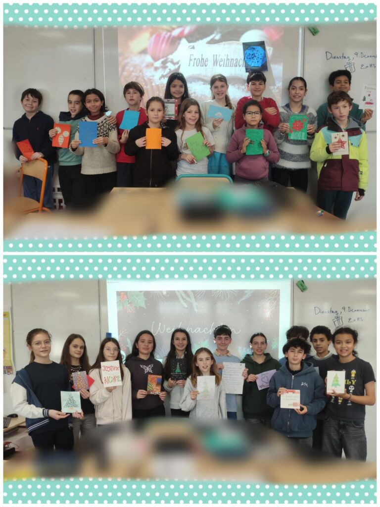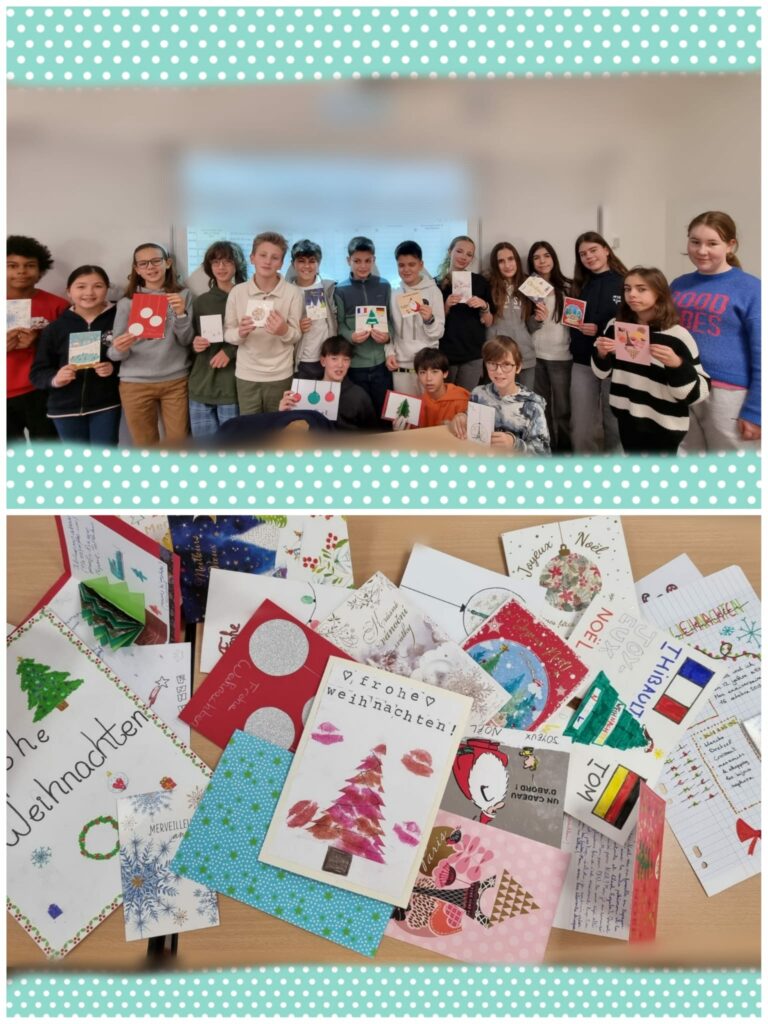 Ainsi, les germanistes débutants des classes 6ème LV1, 5ème LV1 et 5ème LV2 ont écrit des cartes de Noël aux élèves de notre école partenaire, le Kronberg-Gymnasium qui se trouve à Aschaffenburg. Une belle occasion pour eux d’établir le premier contact avec les jeunes Allemands qui ont juste débuté l’apprentissage du français, et de leur souhaiter de joyeuses fêtes. C’est avec beaucoup d’enthousiasme que nos élèves ont découvert les cartes écrites en retour par leurs correspondants allemands juste avant les vacances de Noël. Nous espérons que les élèves vont poursuivre leurs échanges afin de continuer à progresser dans leur apprentissage de l’allemand, mais surtout afin de renforcer les liens avec leurs correspondants.